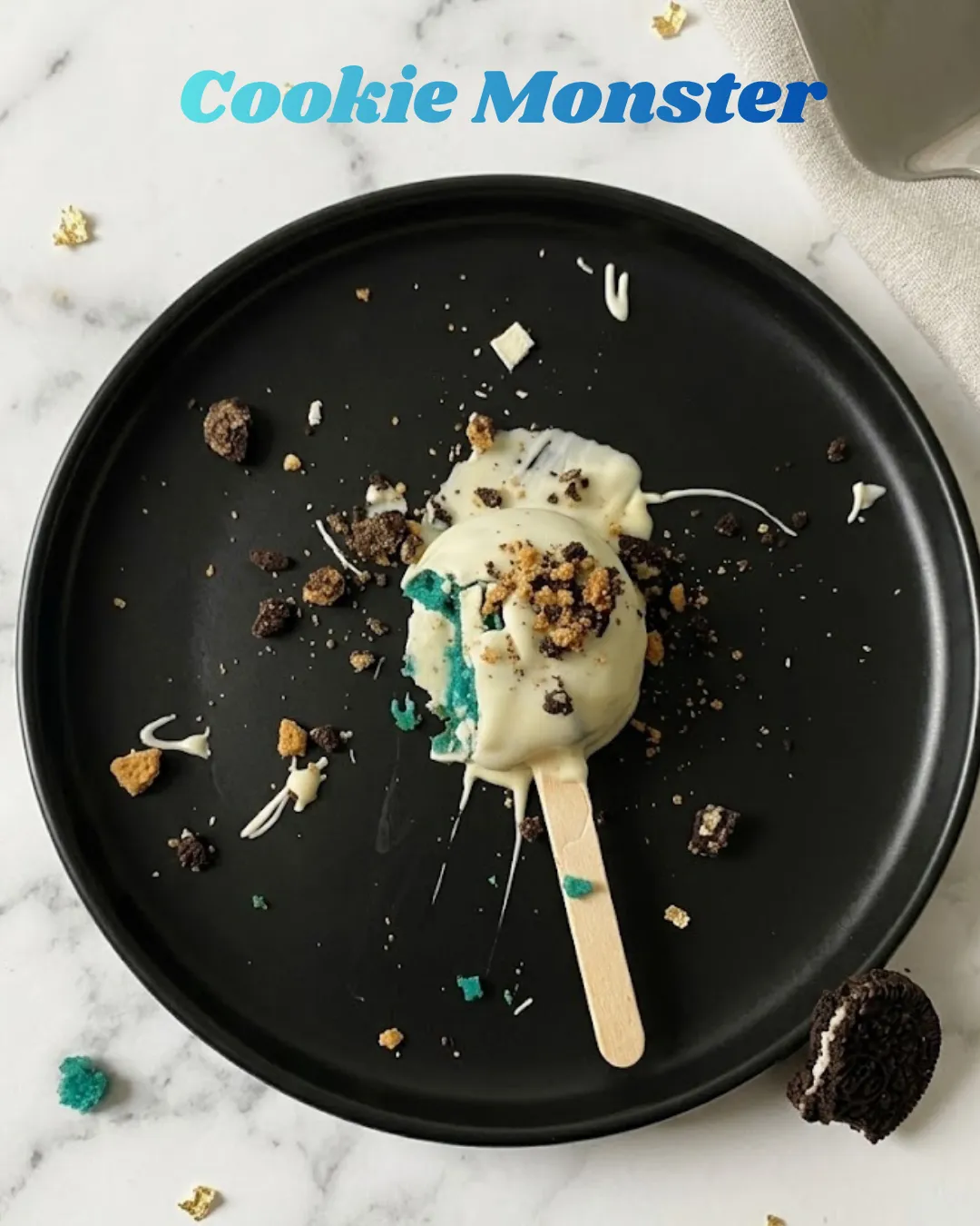 Triple Chocolate Cakepop with a cookie & cream coating, along with crushed Oreo crumbles and a white chocolate drizzle.